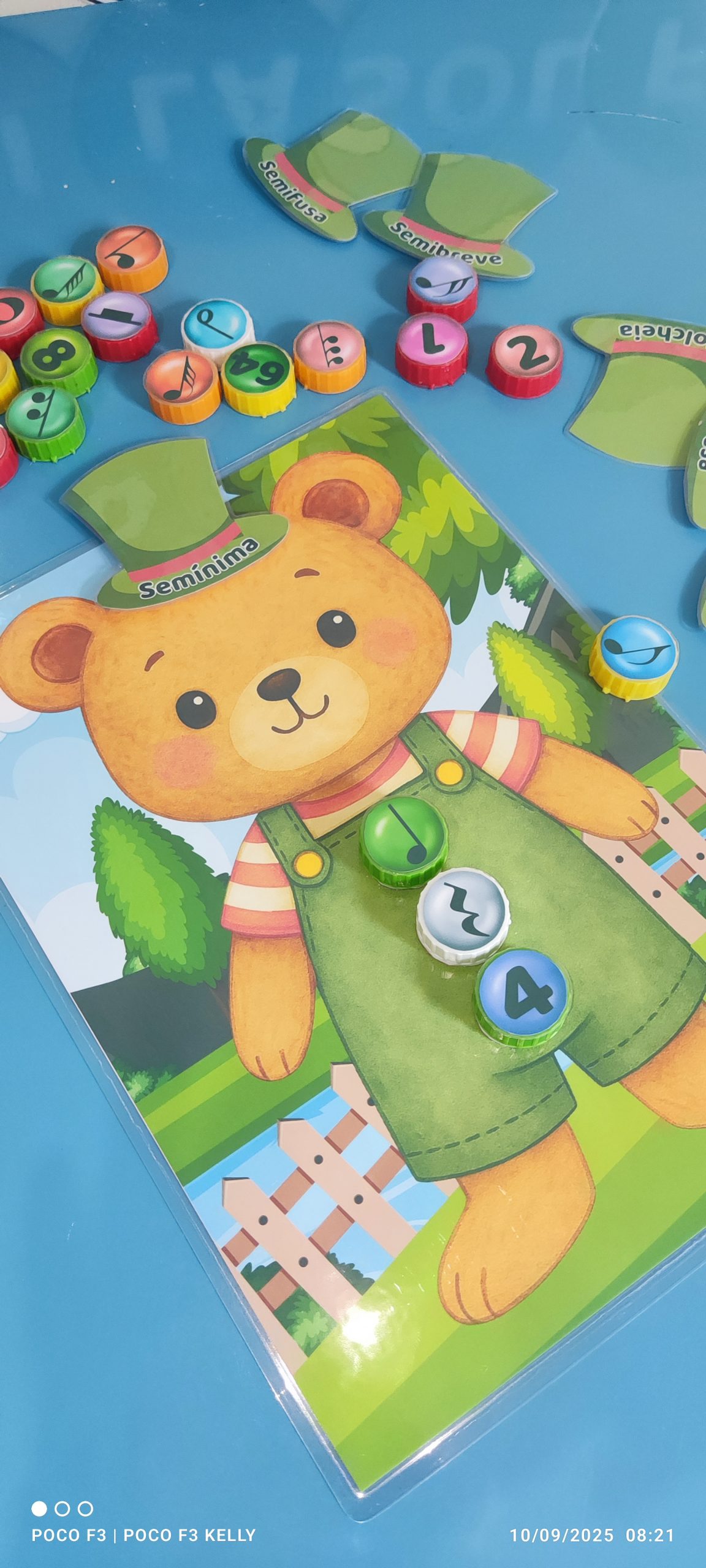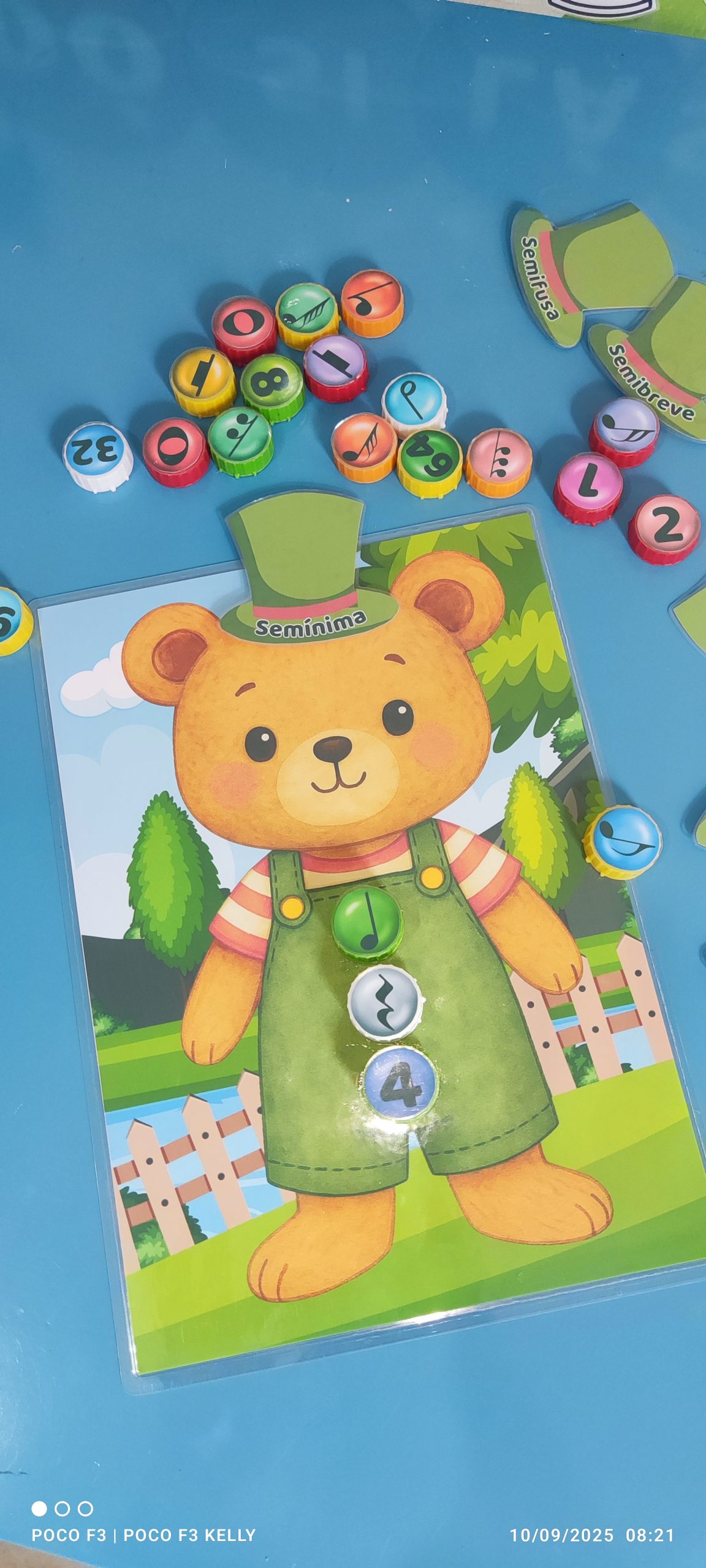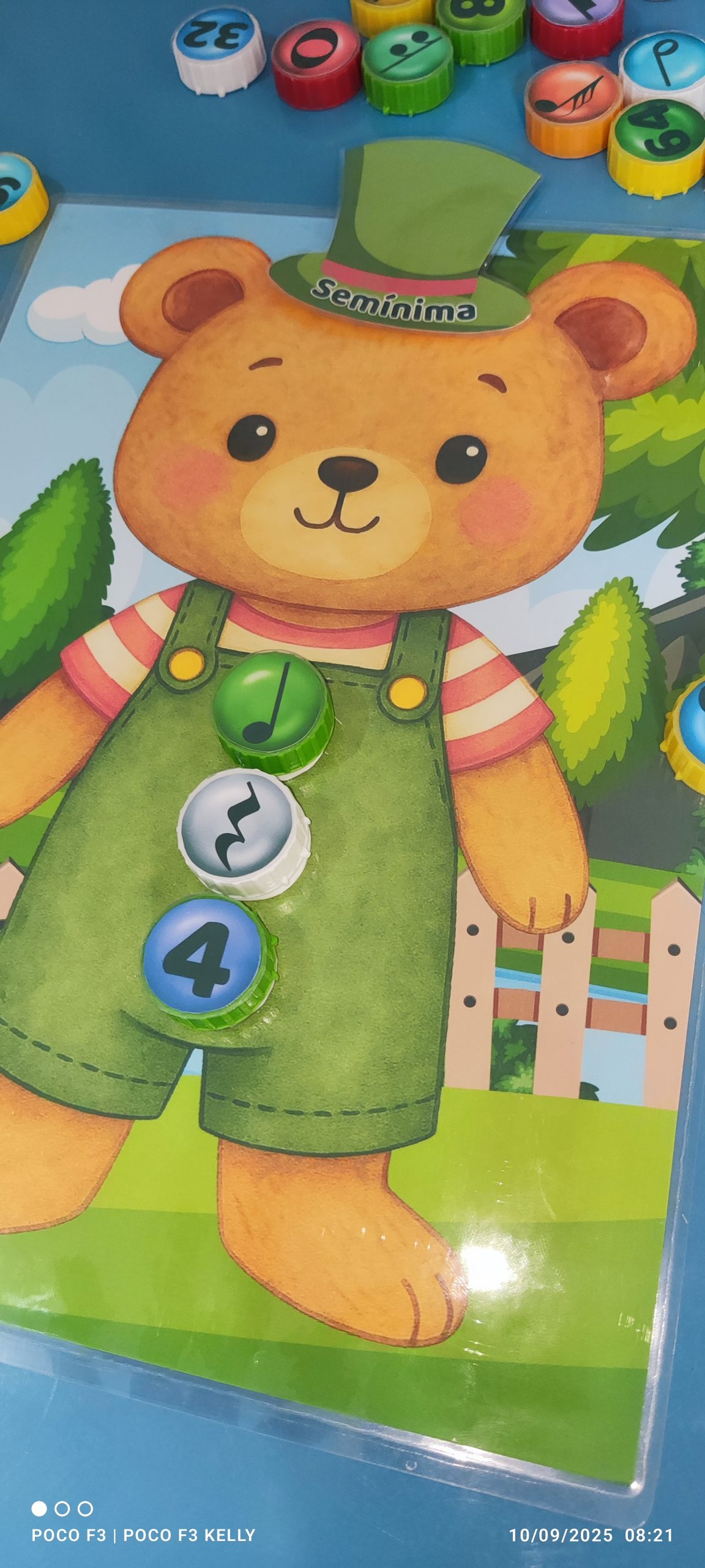 Esse é o nosso jogo do ursinho musical! A criança precisa encontrar a tampinha certa com a figura, a pausa e o número correspondente e enroscar no lugar certo.