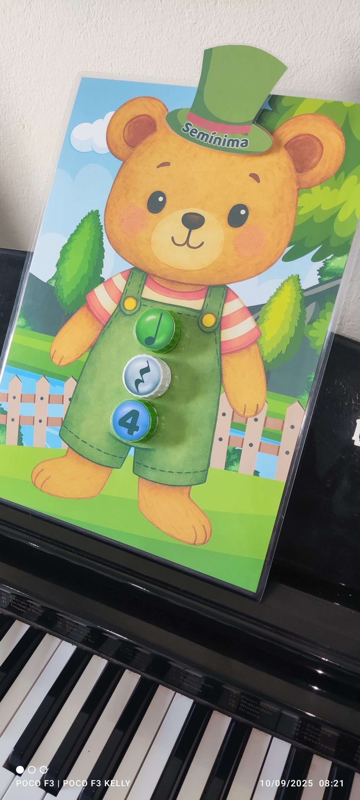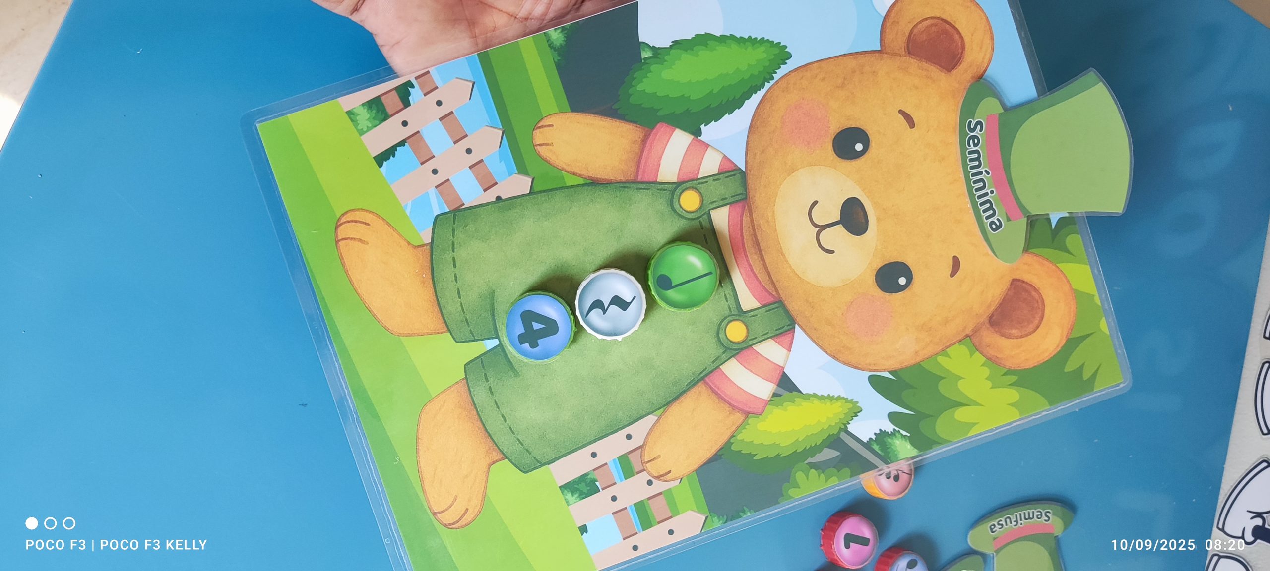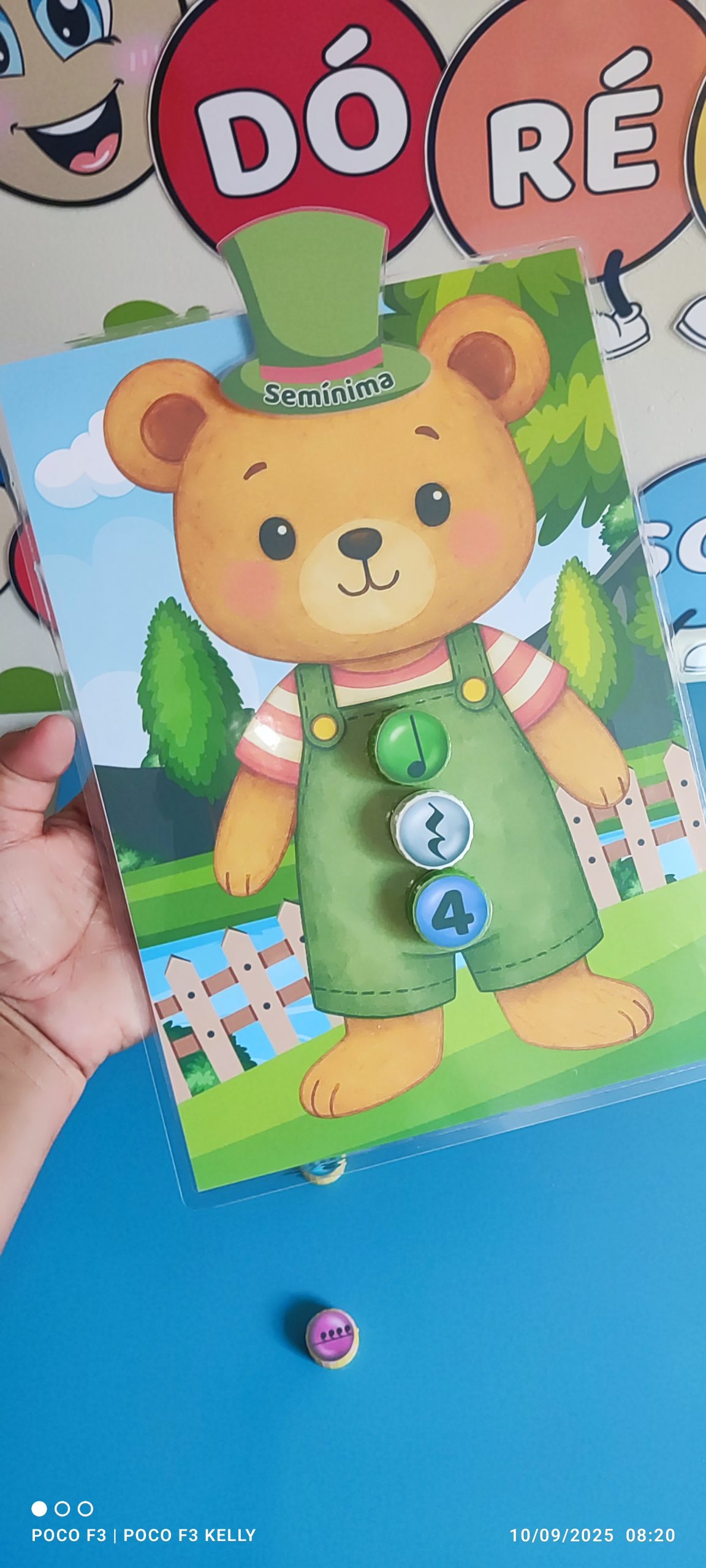 Esse é o nosso jogo do ursinho musical! A criança precisa encontrar a tampinha certa com a figura, a pausa e o número correspondente e enroscar no lugar certo.
